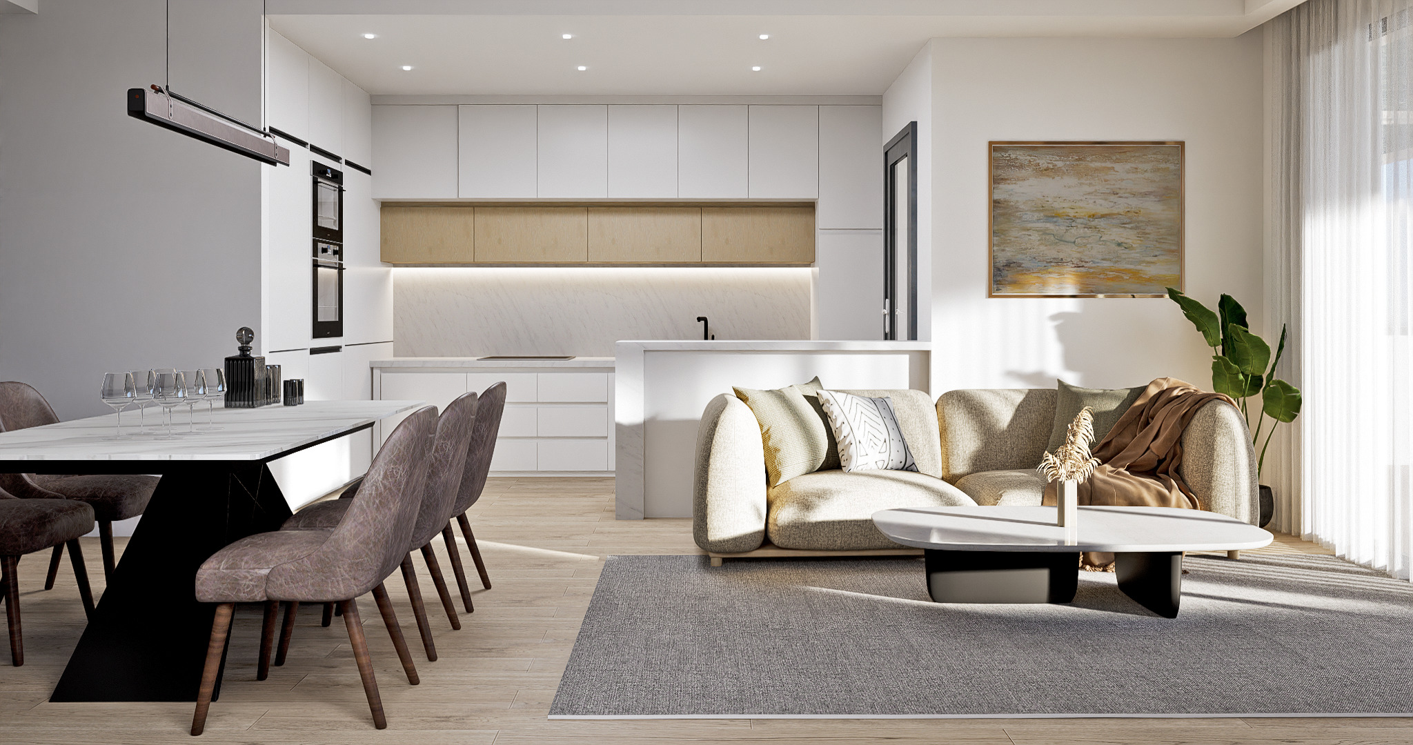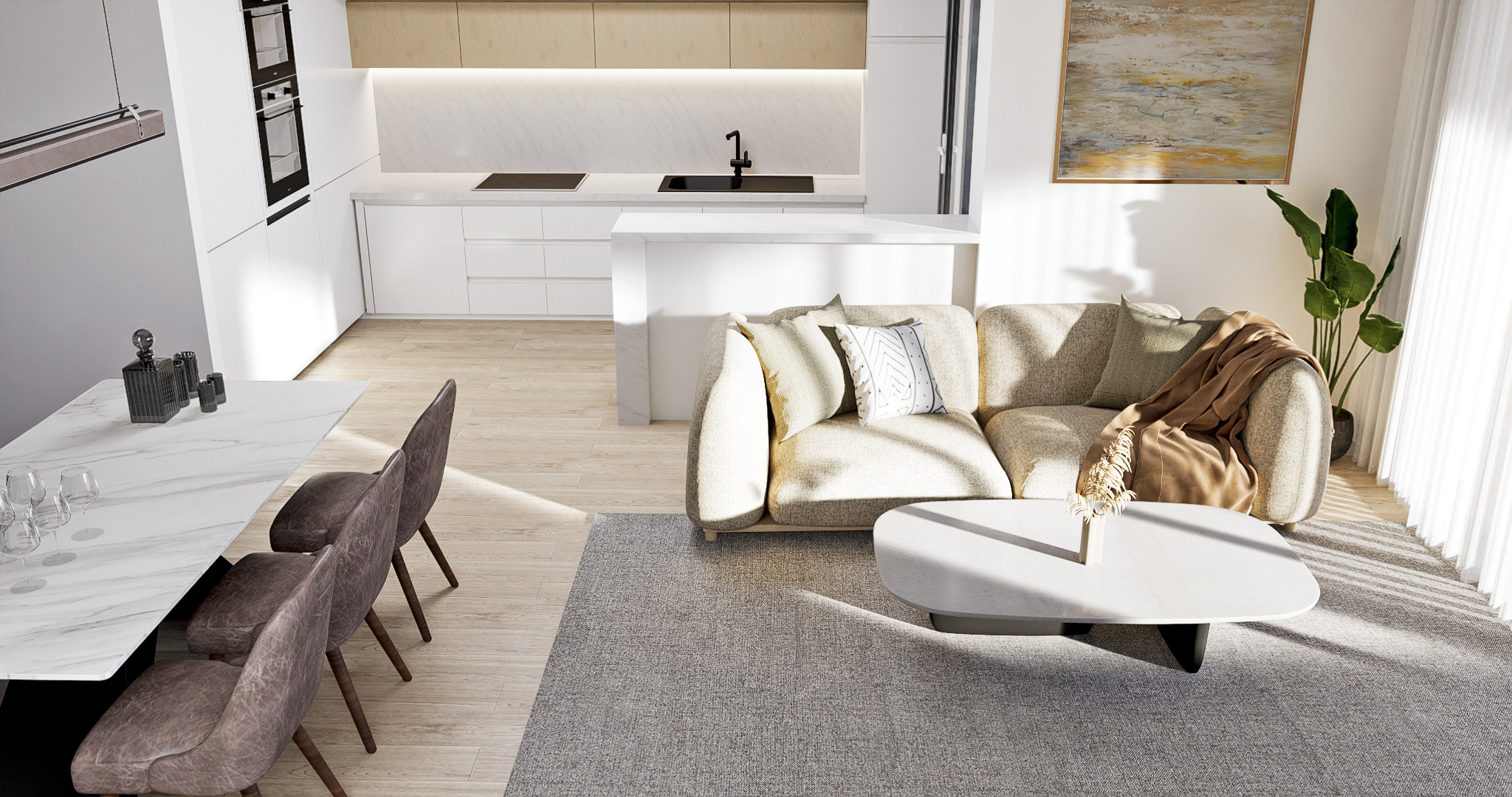 De appartementen zijn verdeeld in een ruime woon-eetkamer met open keuken, drie slaapkamers en twee badkamers. De keuken wordt volledig gemeubileerd opgeleverd met boven- en onderkasten, oven, inductiekookplaat en afzuigkap. Wat betreft de slaapkamers, ze hebben inbouwkasten.