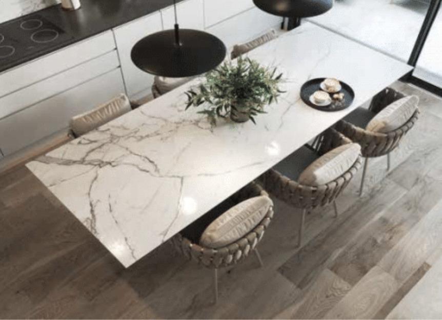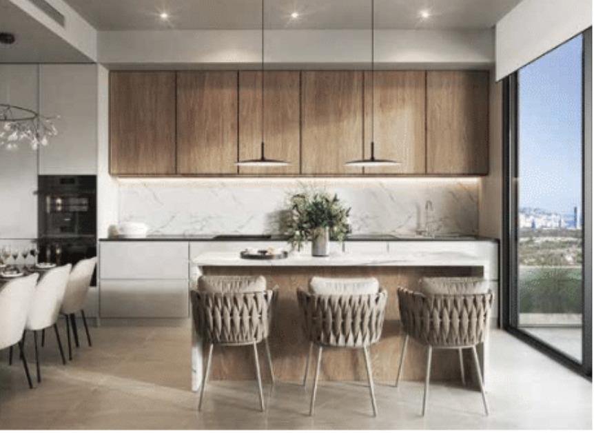 Lichte woonkamer met open keuken voorzien van Boven- en onder keukenmeubilair. De keuken heeft een elegant en modern design.