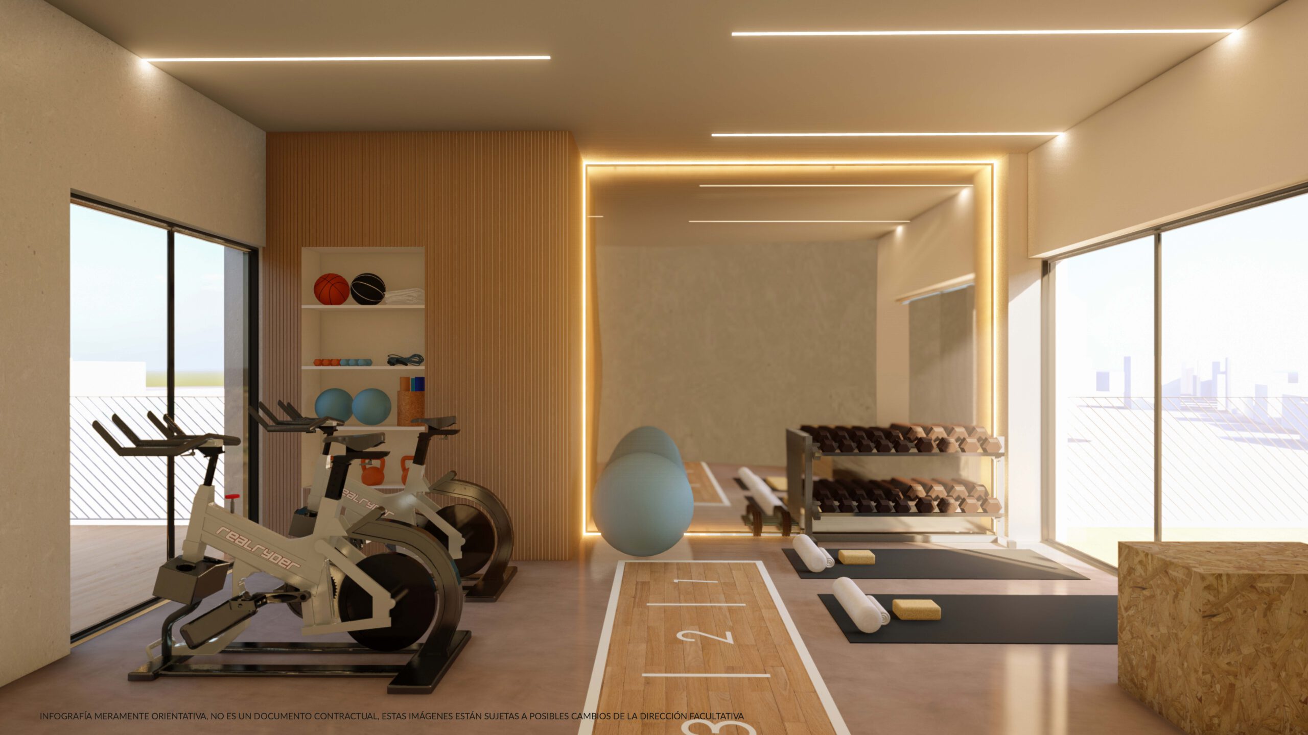 De gemeenschappelijke ruimtes bestaan uit: sociale club, terras, dakterras, fitnessruimte en sauna. Bij de appartementen is een parkeerplaats inbegrepen.