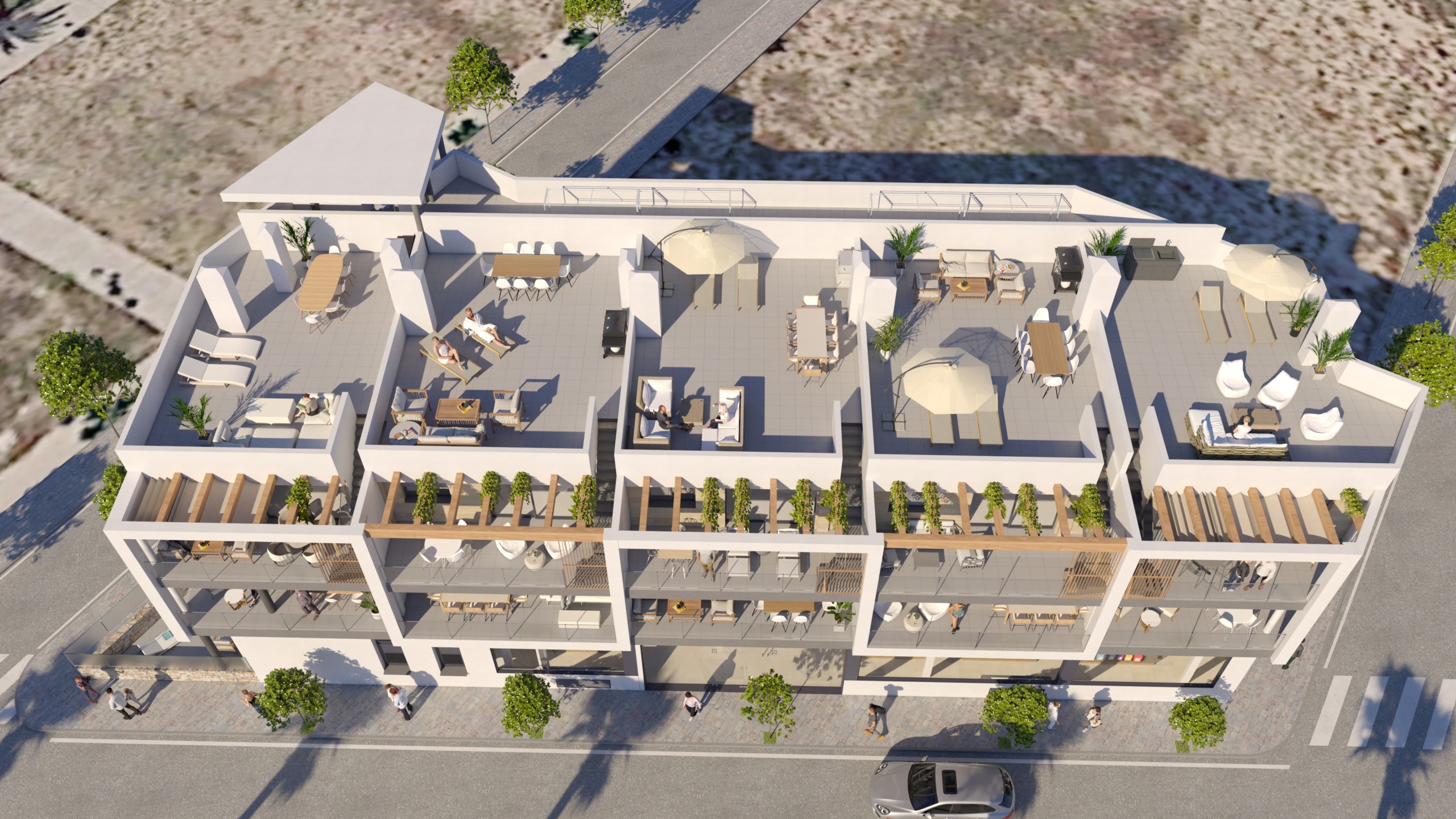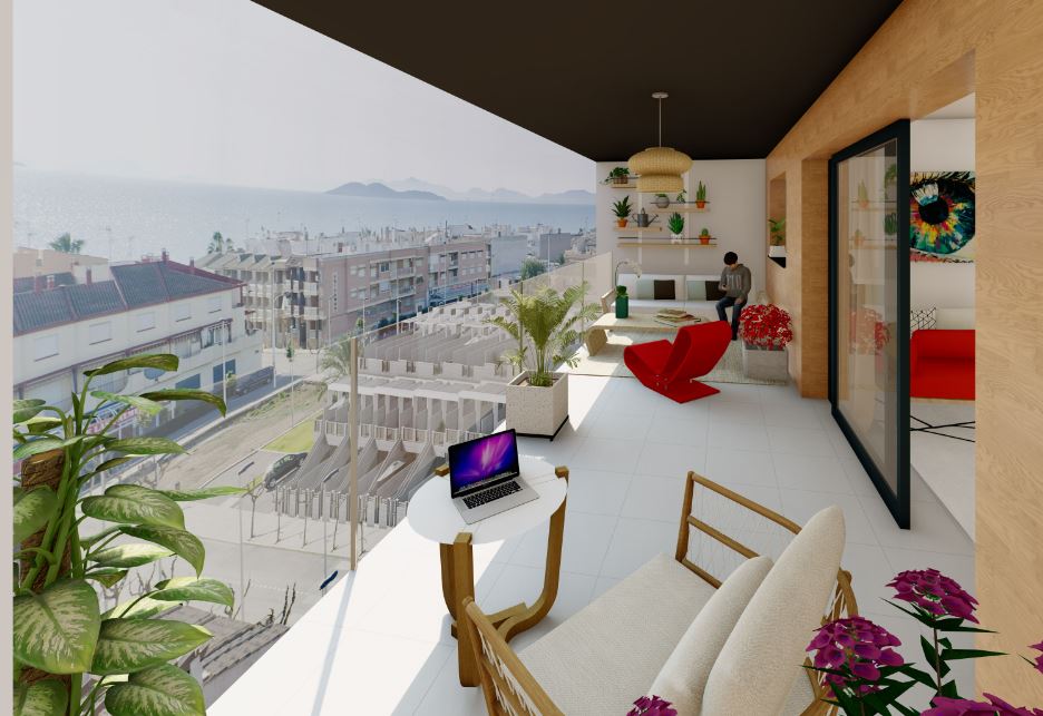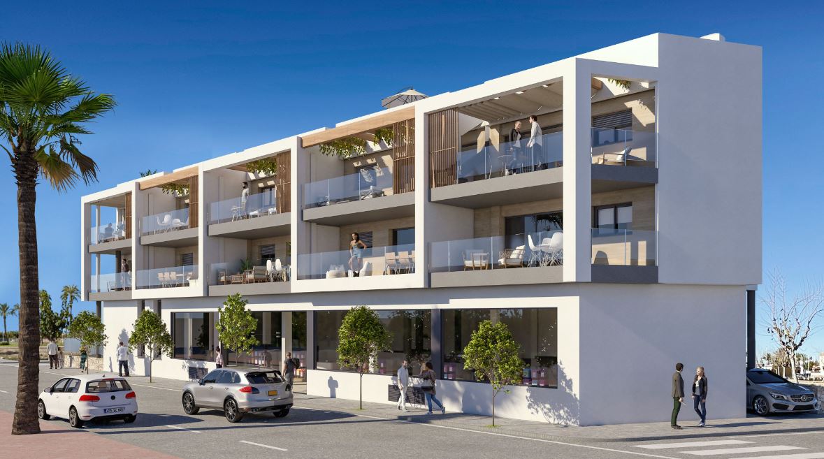 De appartementen hebben drie slaapkamers met inbouwkasten, twee badkamers met doucheschermen en een open woonkamer. De keuken wordt compleet met meubelen, silestone aanrechtblad en inbouwapparatuur opgeleverd. Bovendien beschikken alle woningen over grote terrassen met directe toegang vanuit de woonkamer, grote ramen en uitzicht op zee waardoor u kunt profiteren van de buitenruimte zonder in te boeten aan privacy. De appartementen op de bovenste verdieping zijn uitgerust met een groot solarium voorzien van een zomerkeuken.