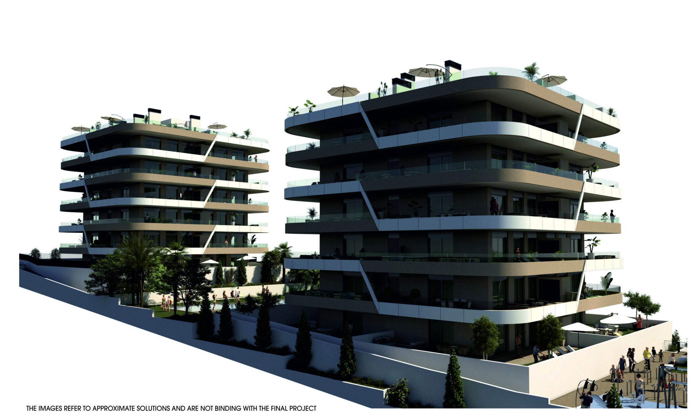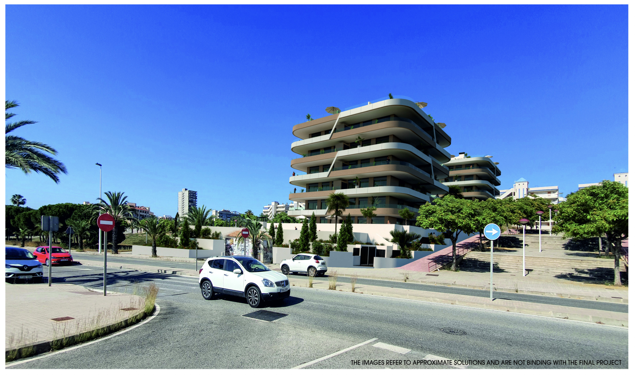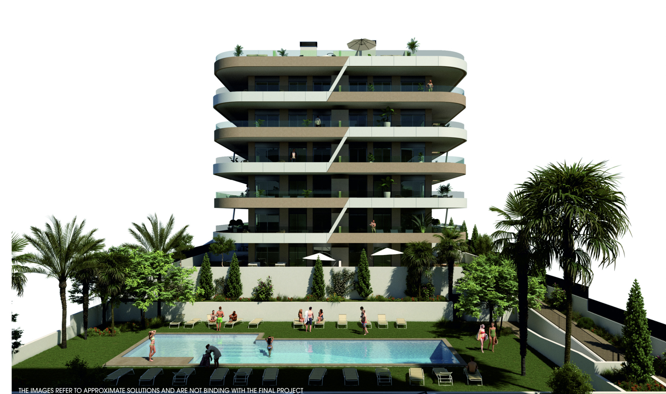Ruime appartementen met 2 slaapkamers en 2 badkamers, met de mogelijkheid van een tuin op de begane grond, een terras op de tussenliggende verdiepingen en een solarium in het geval van de penthouses. Alle buitenruimtes zijn meer dan 55m2, ontworpen om te genieten van de tijd buiten en de bries die uit de zee komt.