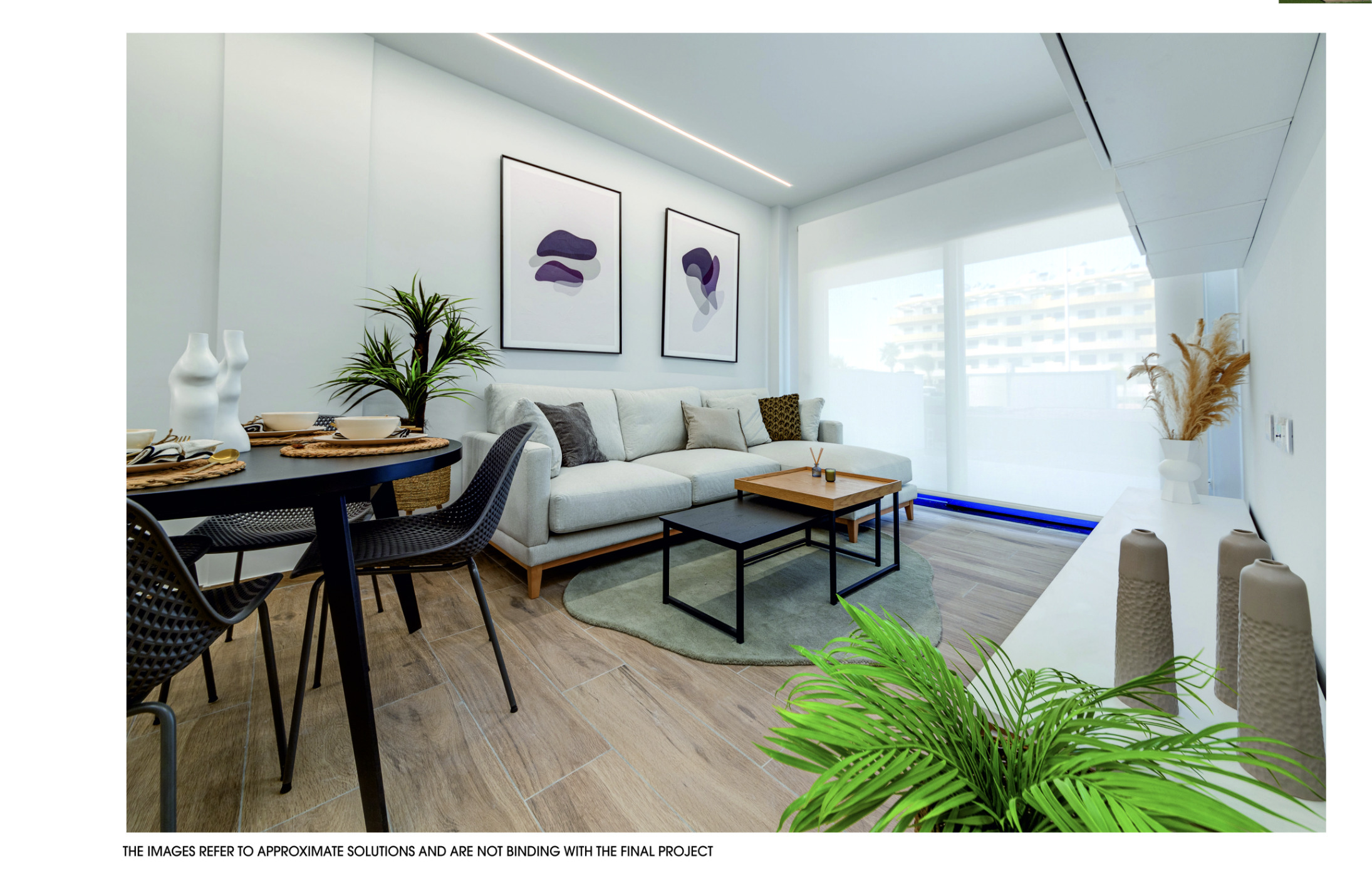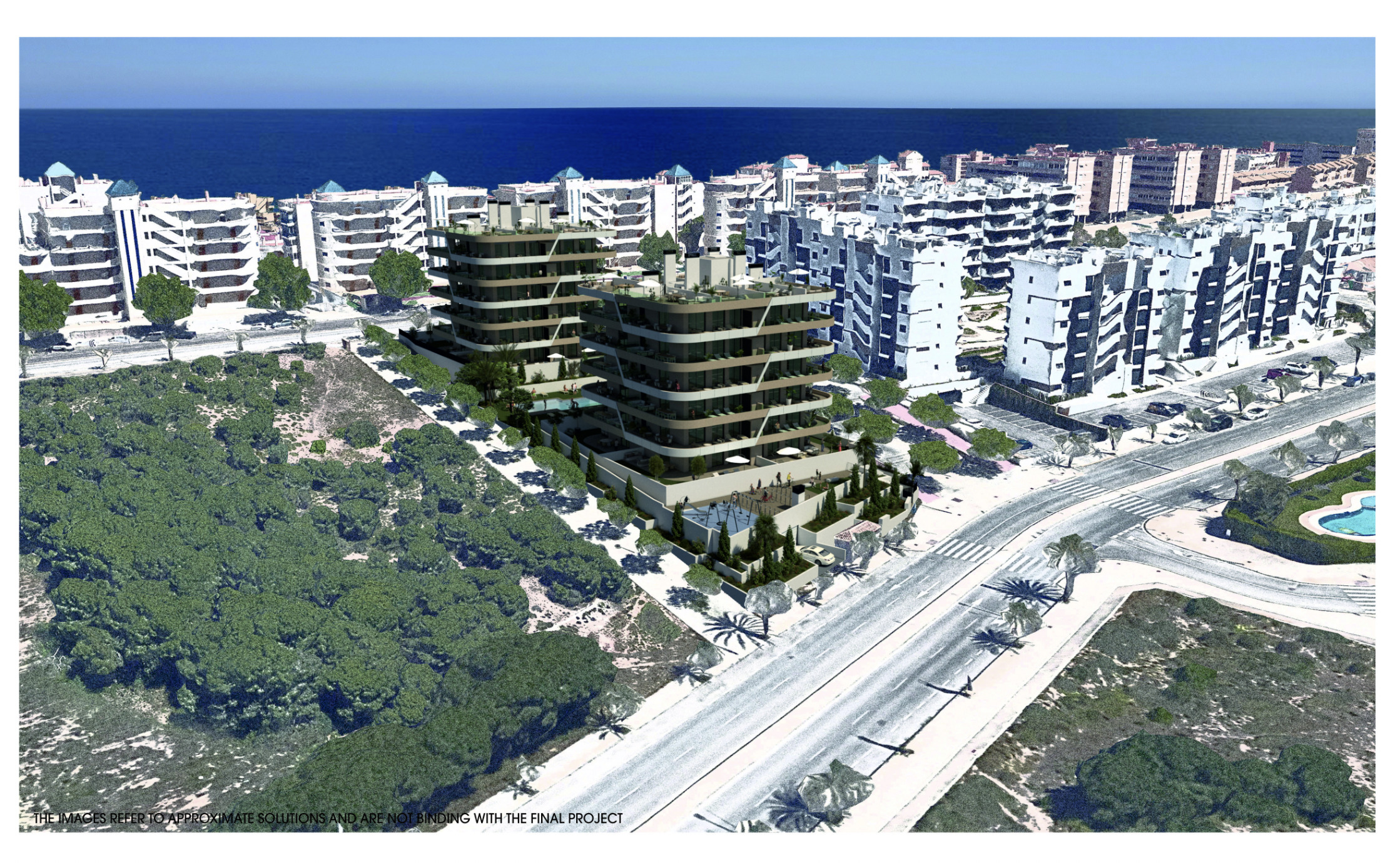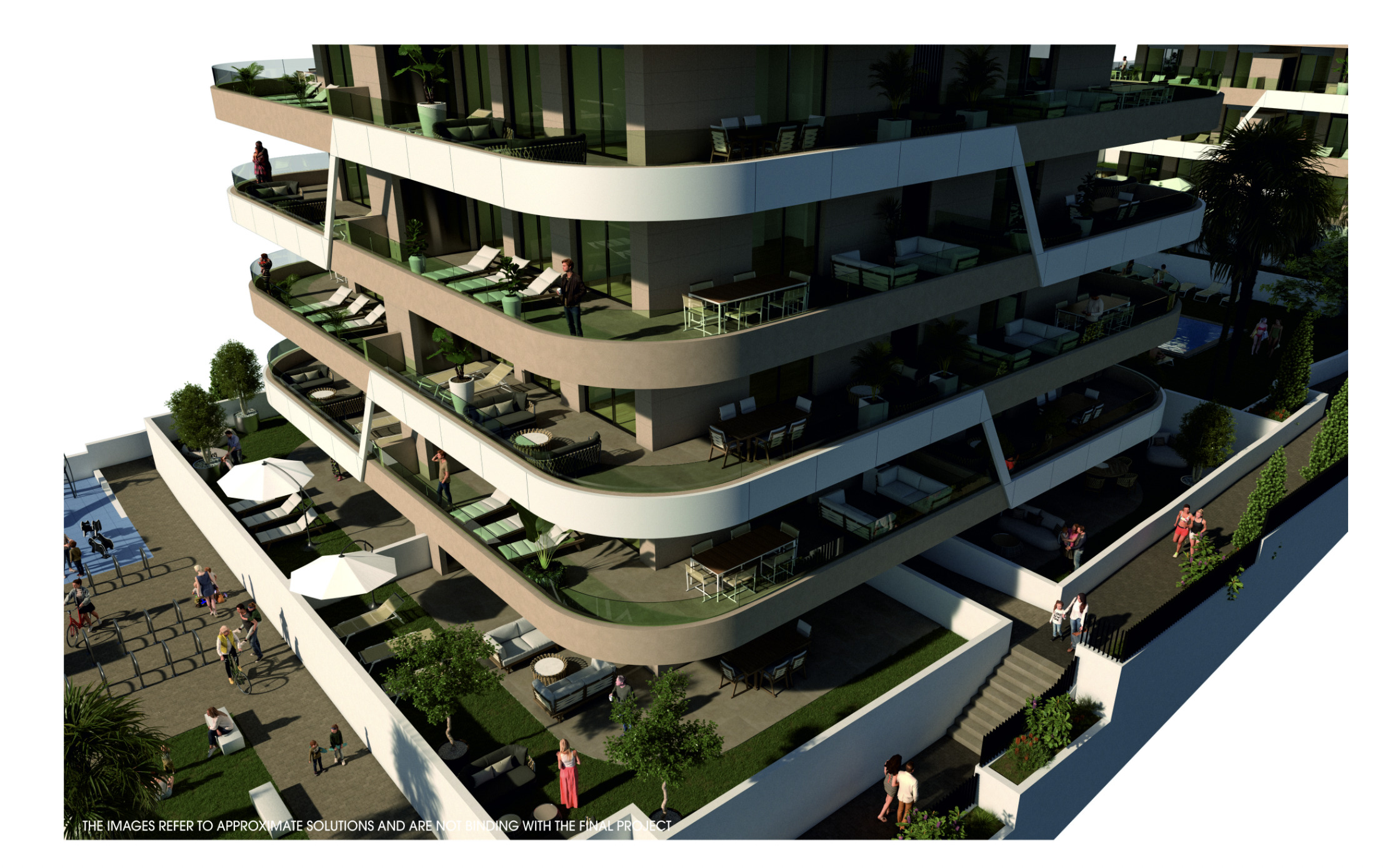 Ruime appartementen met 2 slaapkamers en 2 badkamers, met de mogelijkheid van een tuin op de begane grond, een terras op de tussenliggende verdiepingen en een solarium in het geval van de penthouses. Alle buitenruimtes zijn meer dan 55m2, ontworpen om te genieten van de tijd buiten en de bries die uit de zee komt.