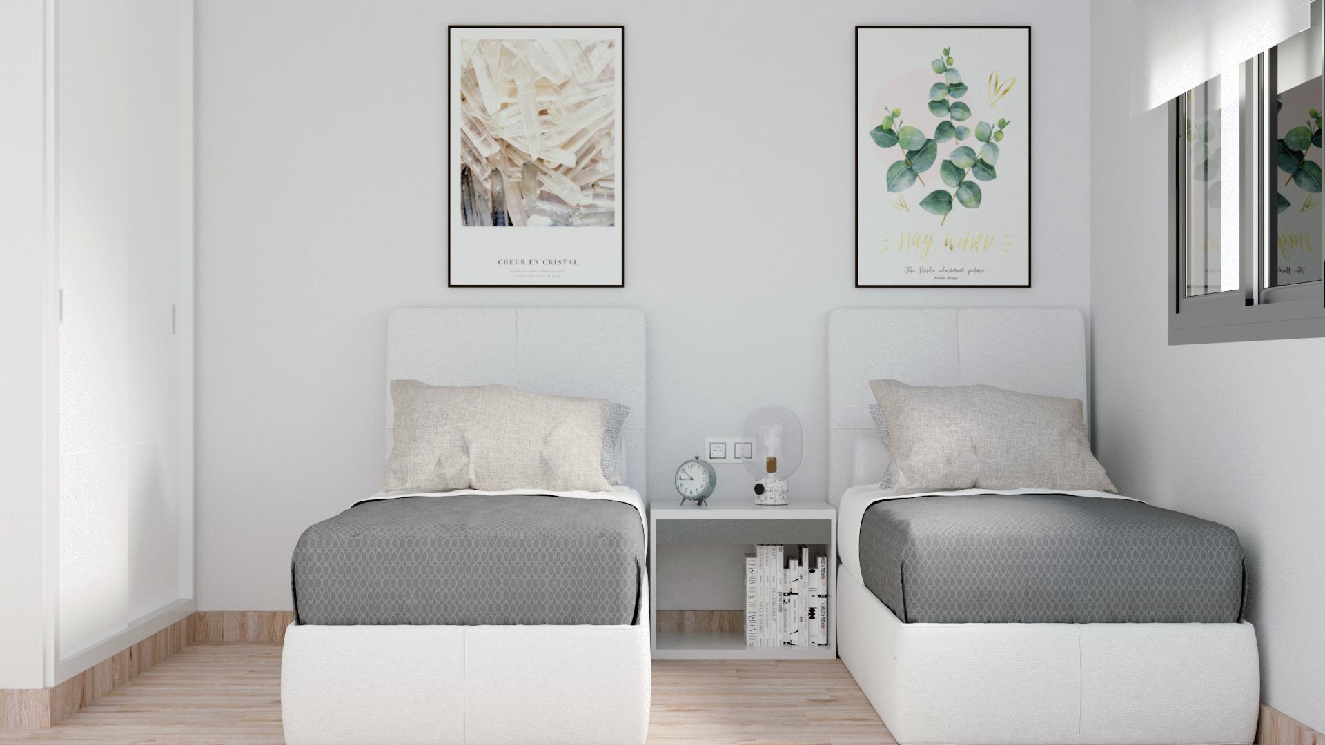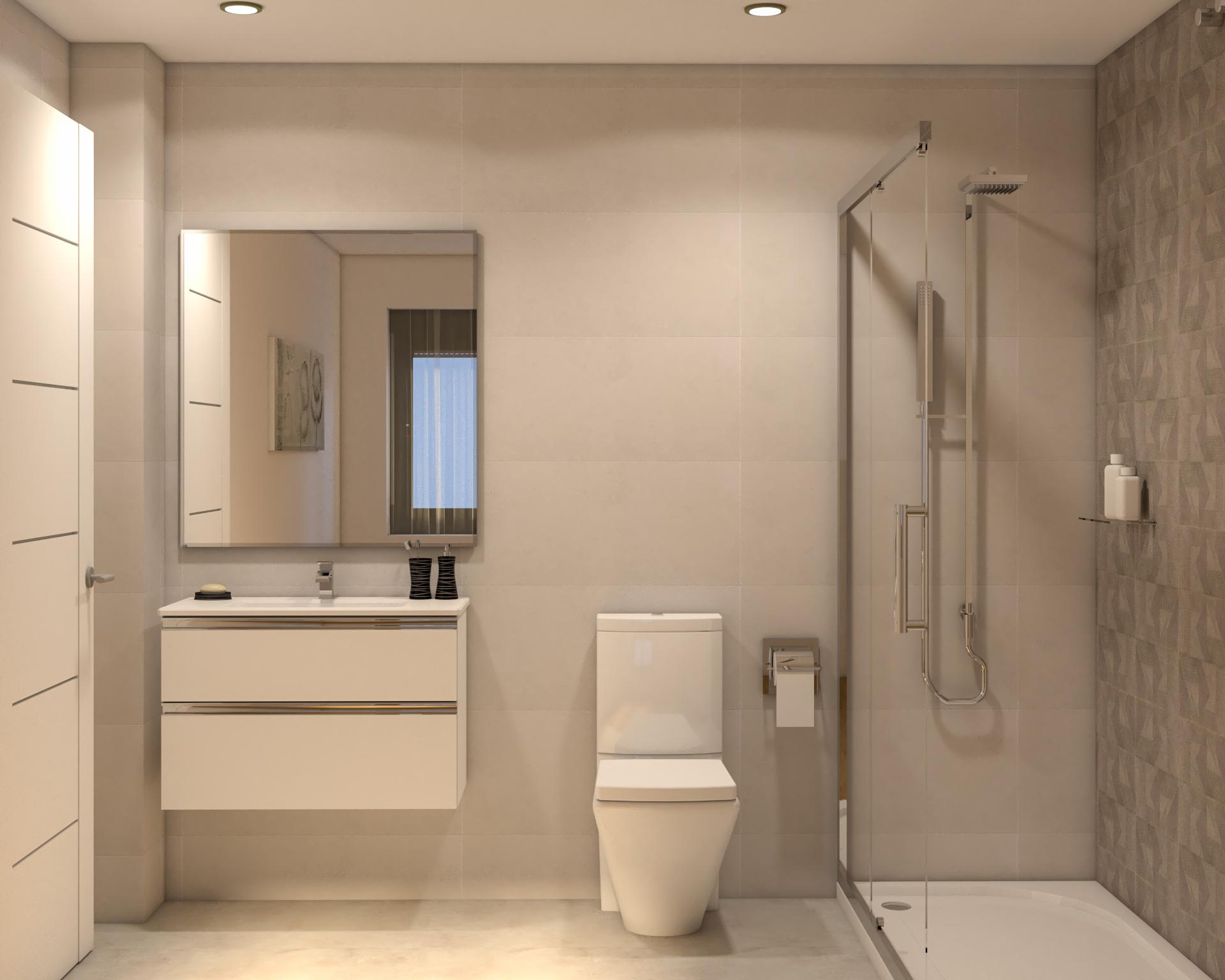 De slaapkamers hebben ingebouwde kledingkasten met schuifdeuren. De badkamers worden opgeleverd met wit badkamermeubilair en porselein sanitair.