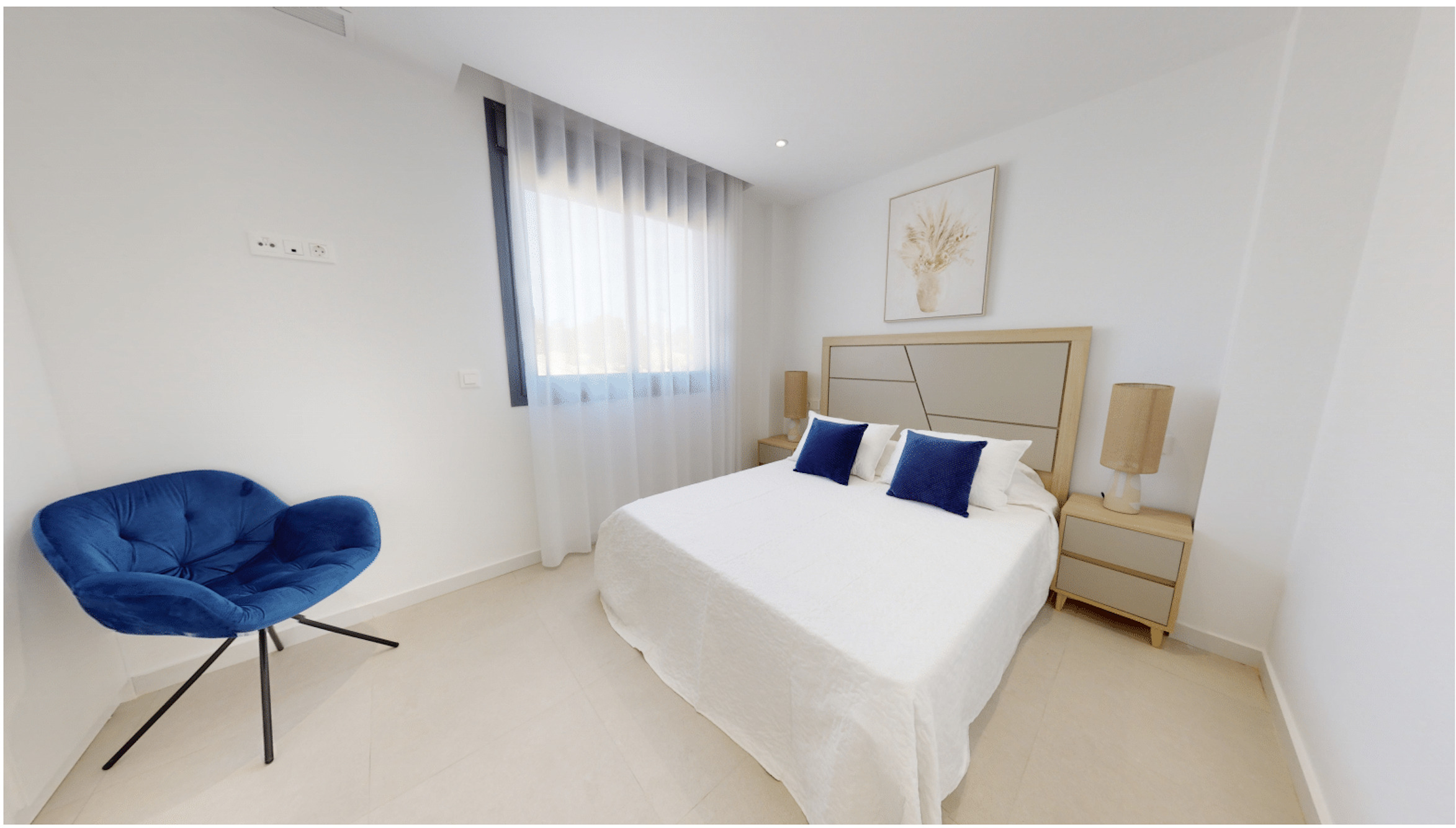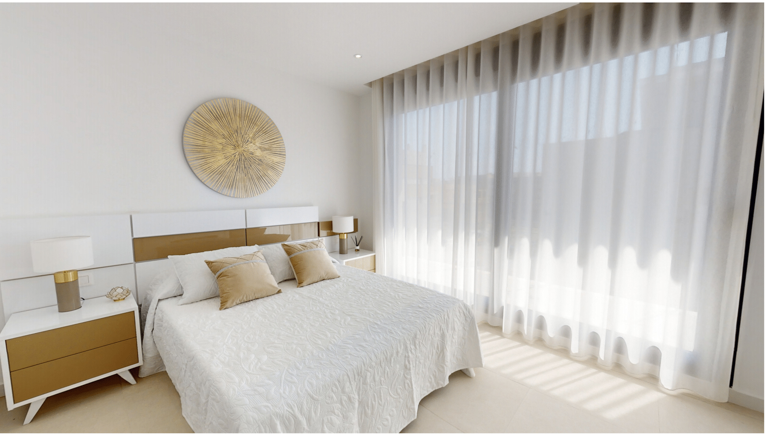 De slaapkamers zijn voorzien van inbouwkasten afgewerkt in glad wit hout met schuifdeuren, dubbele beglazing en elektrische zonwering.