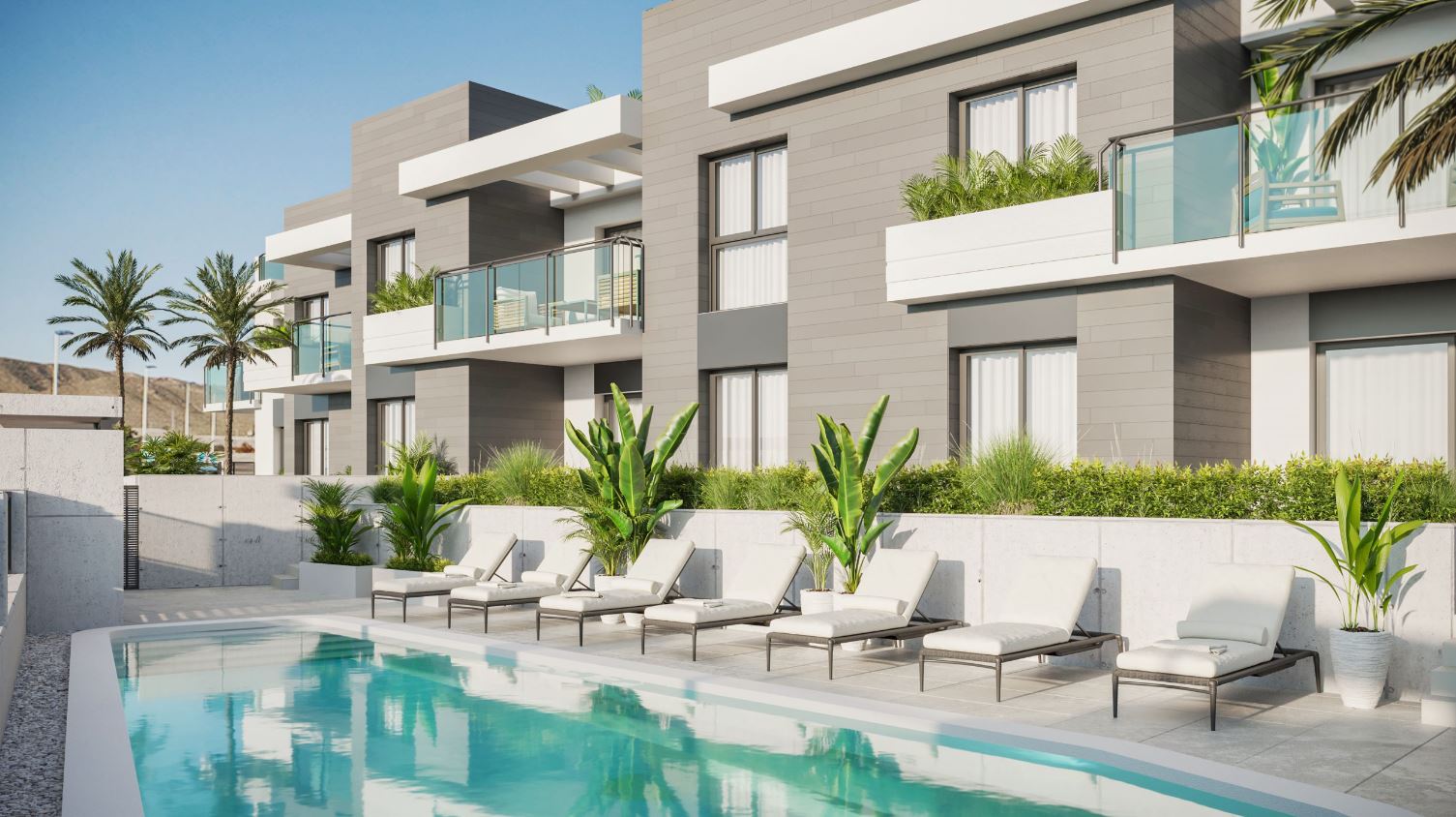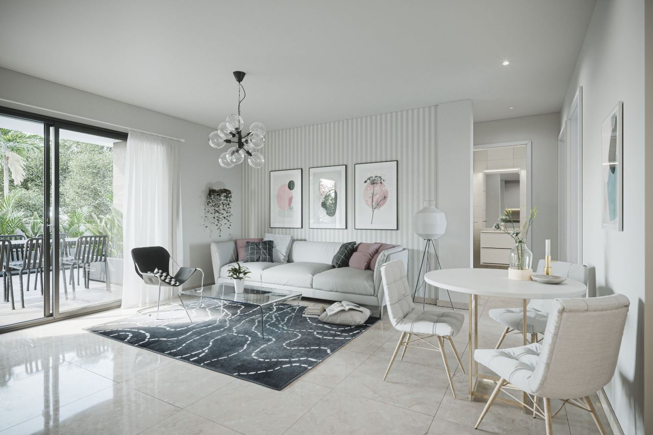 Mooie appartementen met twee-drie slaapkamers en twee badkamers op de begane grond of boven, de eerste met grote tuinen en de tweede met een solarium. Alle woningen hebben twee ondergrondse parkeerplaatsen en een berging.