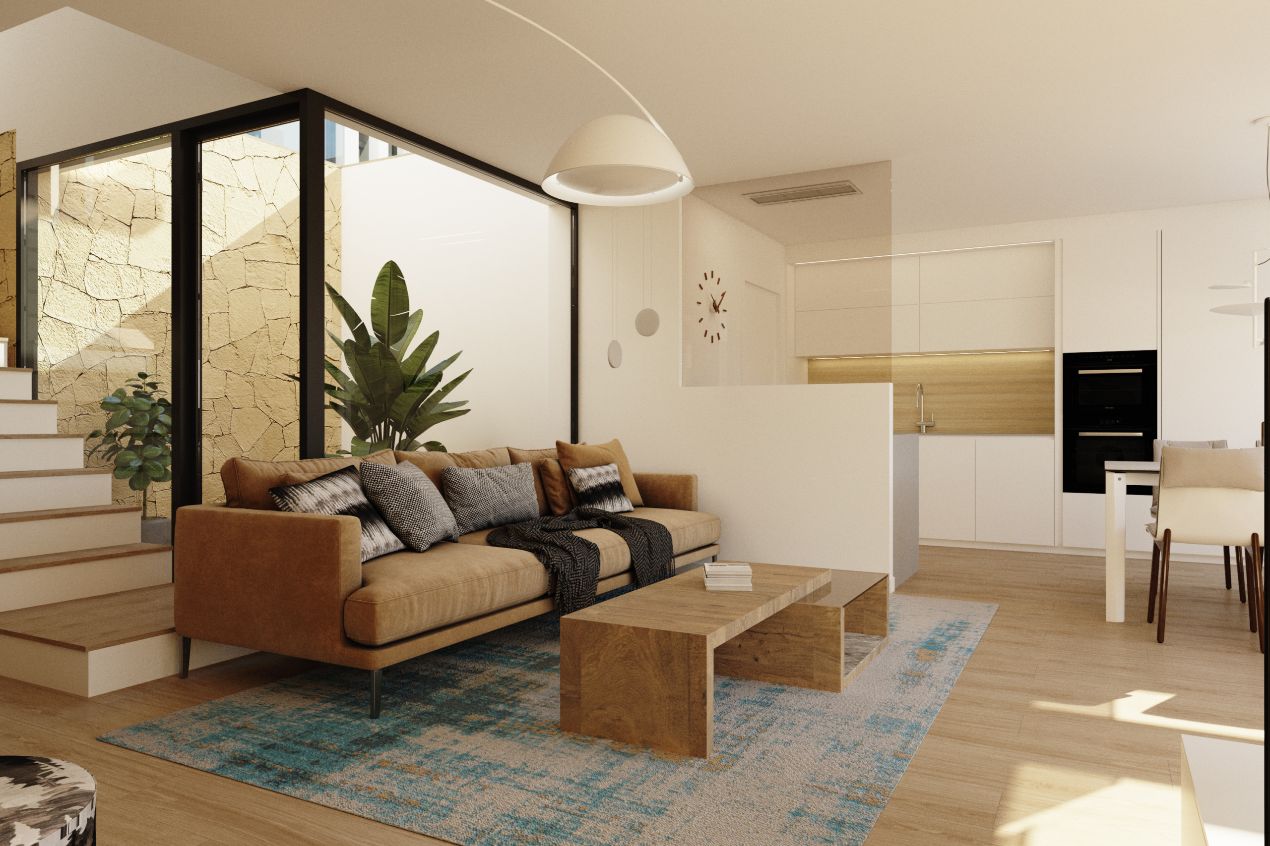 De begane grond is verdeeld in een ruime woonkamer met open keuken, twee slaapkamers, twee badkamers, wasruimte, berging en binnen patio. De keuken wordt compleet opgeleverd met hoge en lage kasten, zelf remmende lades, geïntegreerde kolom voor conventionele oven en magnetron, geïntegreerde afzuigkap in de bovenkast en elektrische apparaten inbegrepen. De slaapkamers hebben inbouwkasten met lades en de badkamers hebben douches met horren en meubilair.