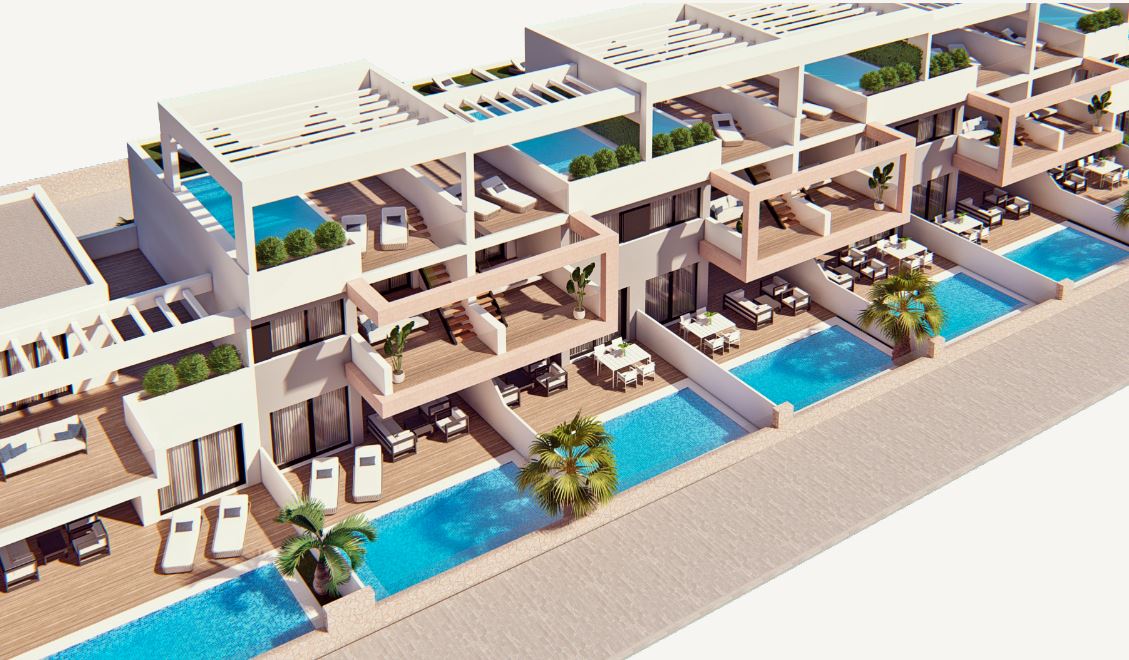 Geweldige woningen van verschillende typen: herenhuizen, geschakelde woningen of appartementen op de bovenste verdieping of begane grond met twee-drie slaapkamers en twee badkamers. Alle woningen beschikken over grote terrassen en de herenhuizen, geschakelde woningen en bovenwoningen hebben een solarium.