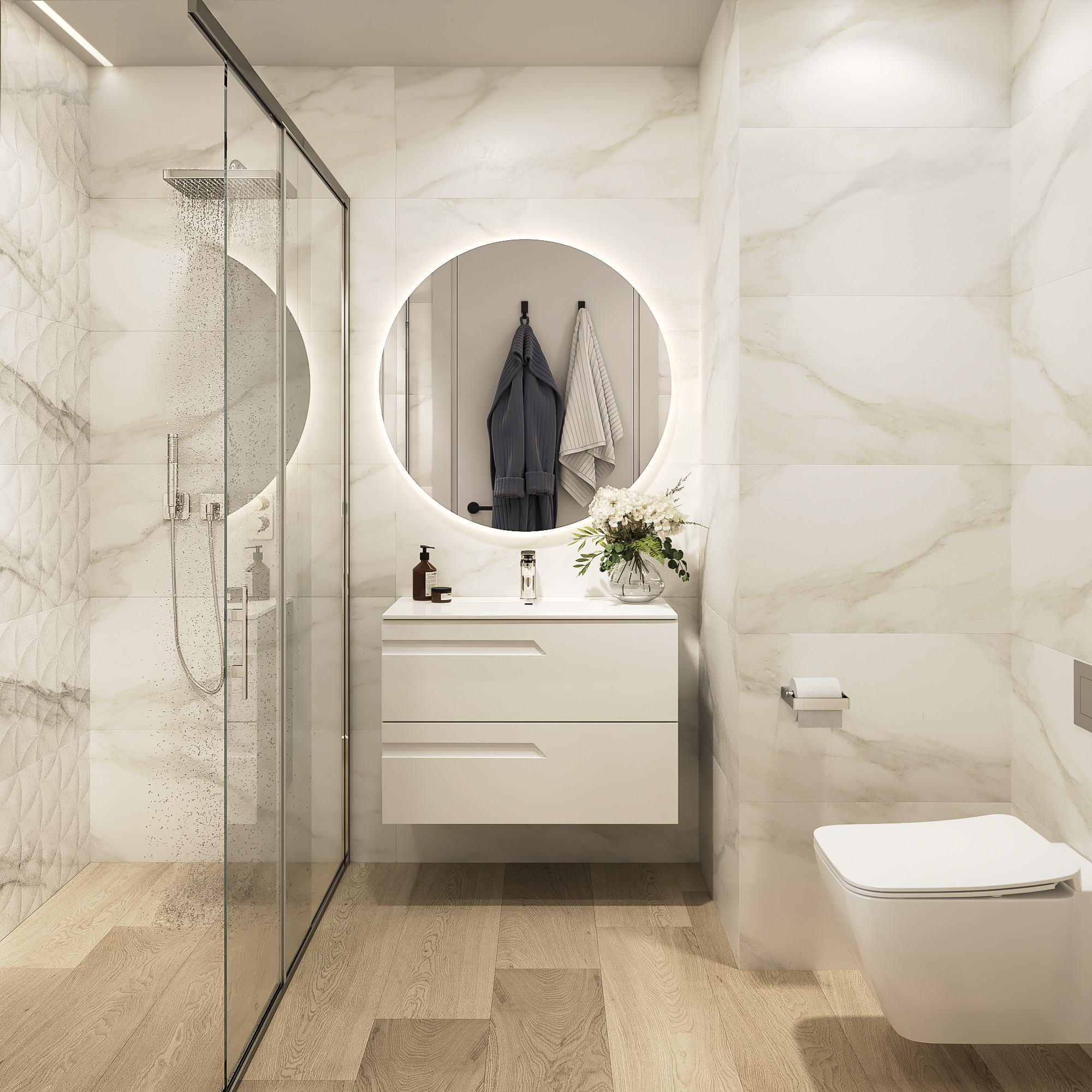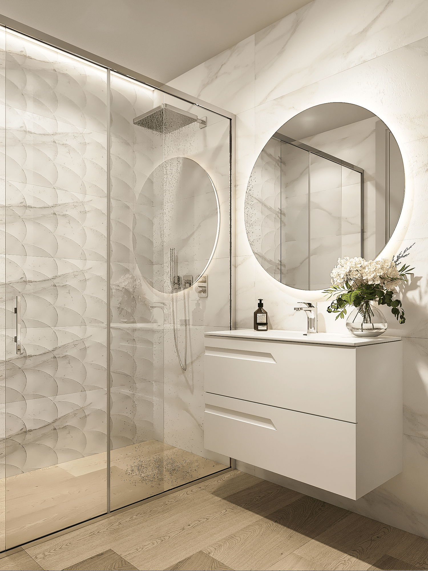 De slaapkamers zijn uitgevoerd met inbouwkasten en de badkamers hebben een hangende wastafel, meubels en schermen.