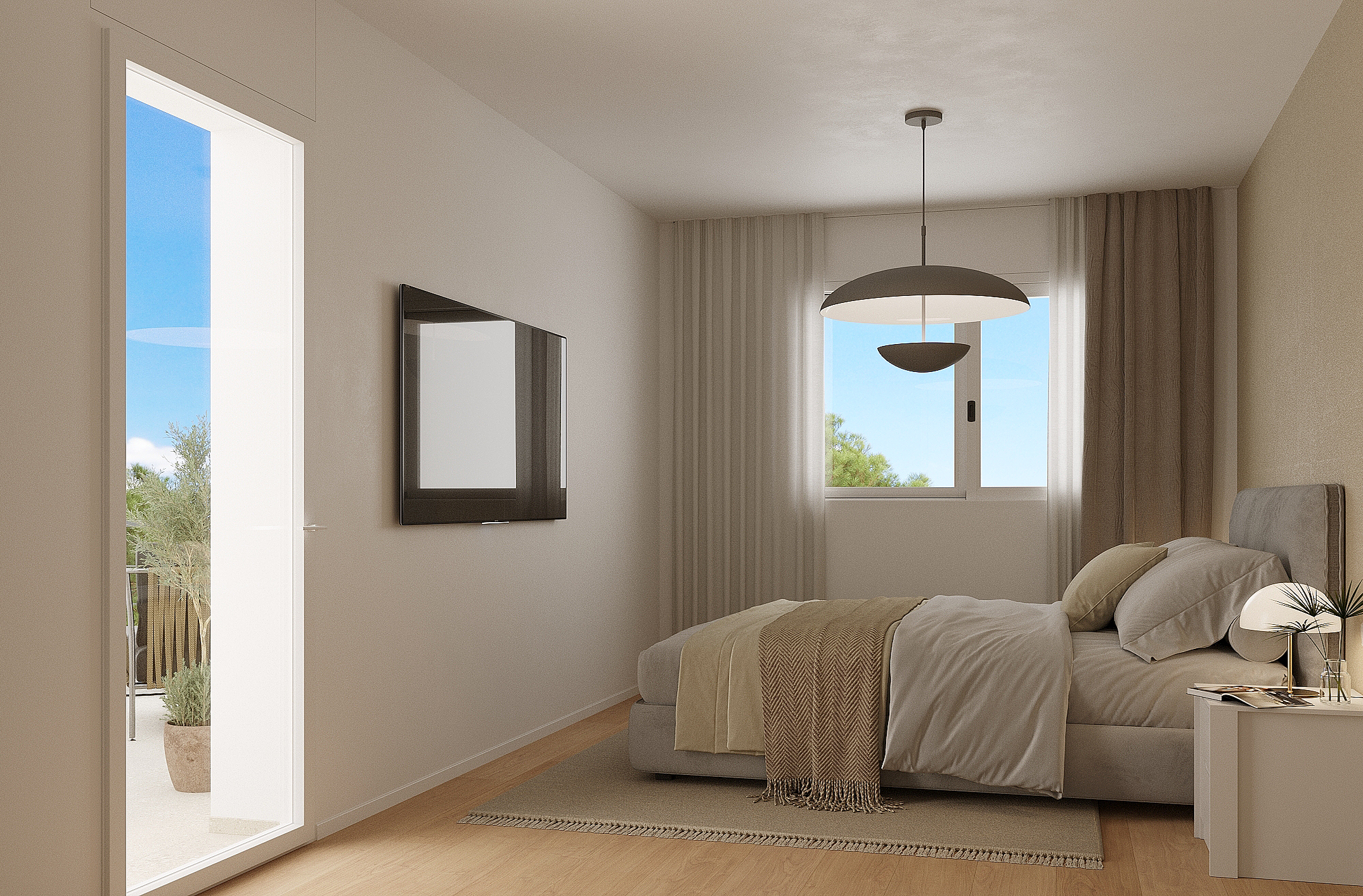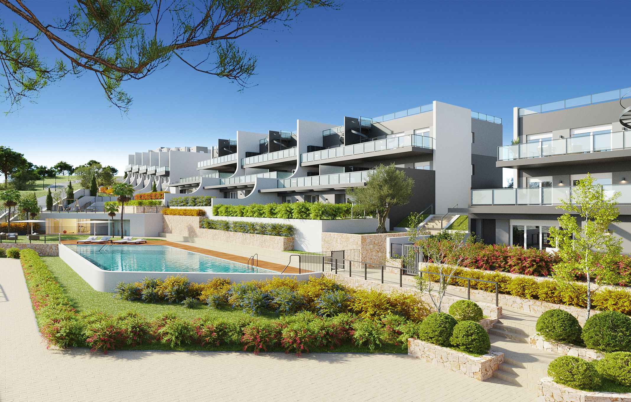 De appartementen met twee en drie slaapkamers en twee badkamers hebben een zeer goede indeling en genieten van een prachtig uitzicht op de gemeenschappelijke ruimtes met zwembad en privétuinen, de natuurlijke omgeving, de skyline van Benidorm en sommige appartementen hebben ook uitzicht op zee. Er is keuze tussen gelijkvloers met tuin, een mezzanine met terras of een penthouse met solarium.