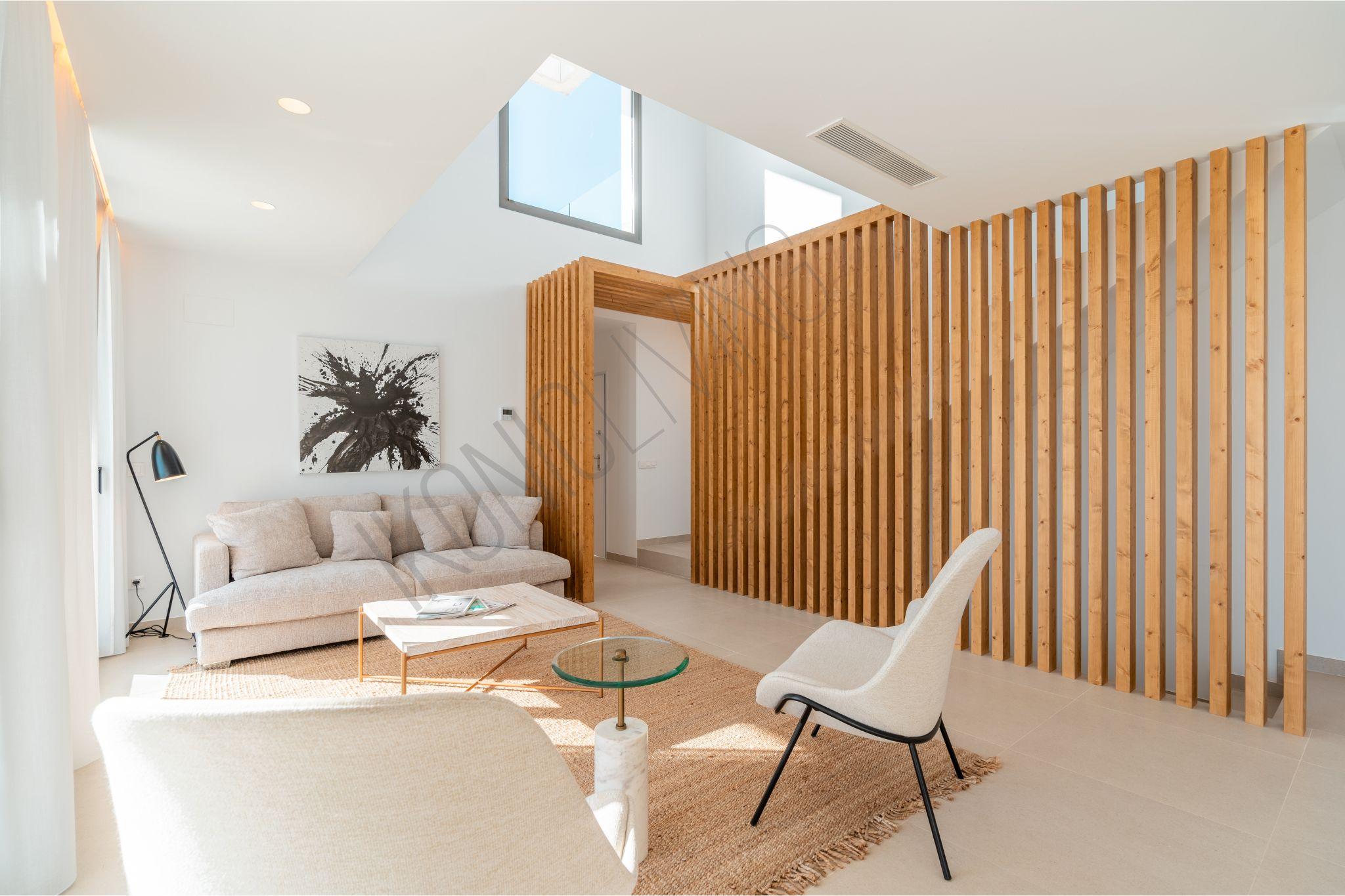 Buitenruimtes: de villa’s hebben een oprit afgewerkt met betonnen bestrating, een automatische toegangspoort, een zwembad van gewapend beton, een tuinontwerp met programmeerbare automatische irrigatie een omheining middels muren van zichtbaar beton en een metalen wand aan de hoofdgevel.