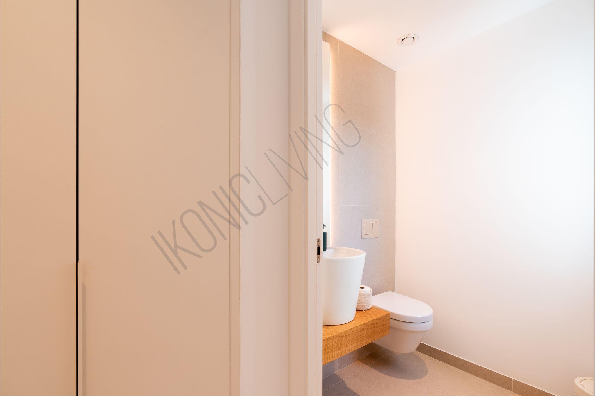 Op de begane grond bevindt zich een grote woonkamer van ruim 40 m2, een wasruimte, een toilet en een slaapkamer met badkamer. De woonkamer is geïntegreerd in de keuken en wordt opgeleverd in een hoogwaardig design met een matte laminaat- of houtafwerking. Alle keukenapparatuur is inbegrepen.