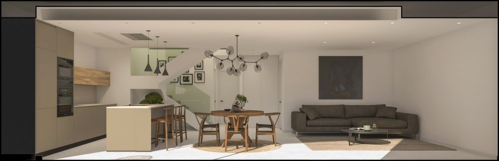 Op de begane grond heeft de villa een grote woon-eetkamer en een open keuken met grote ramen, een aparte wasruimte, één complete badkamer,één slaapkamer met een ingebouwde kledingkast en een buitenterras met een pergola.