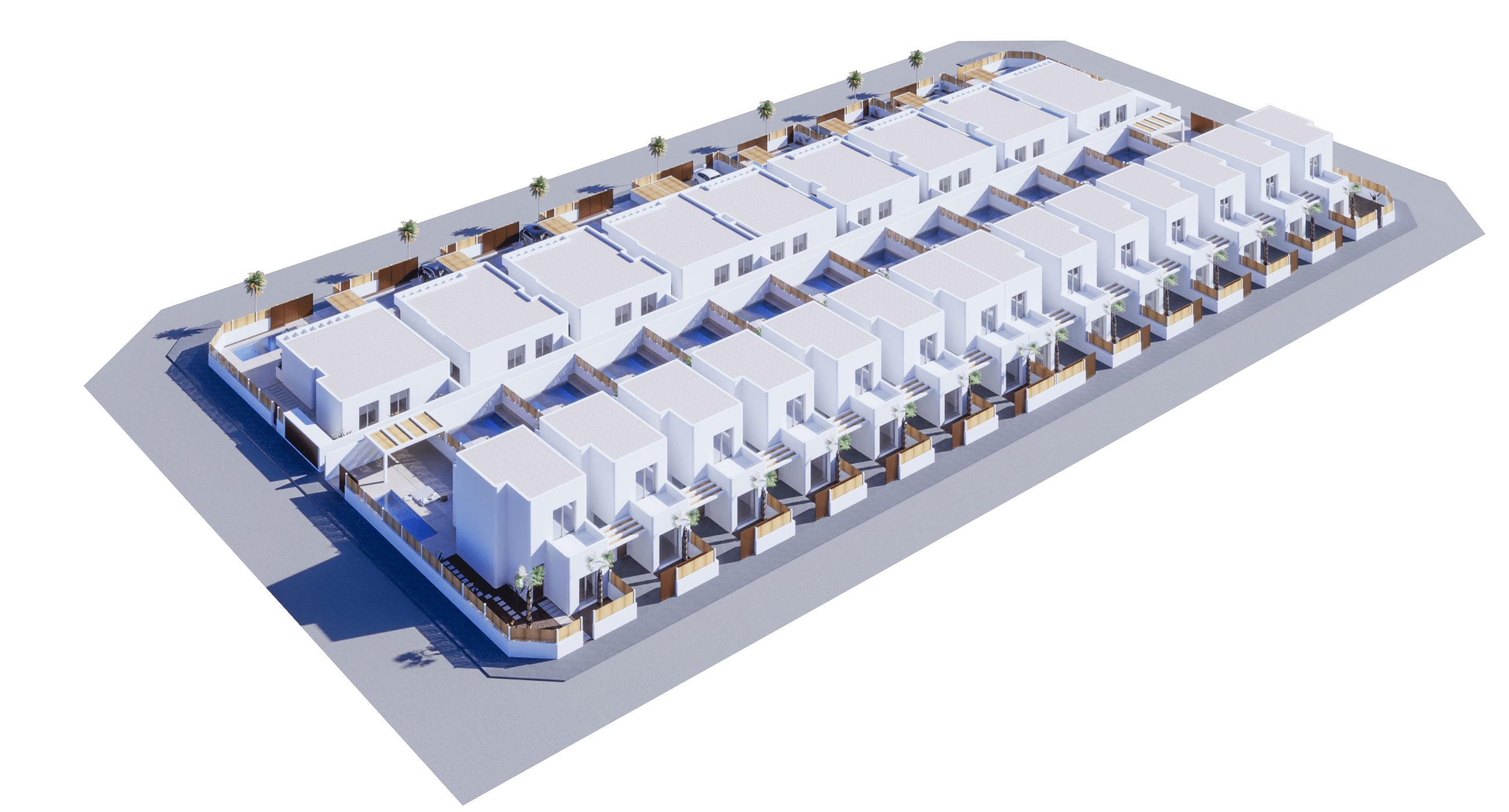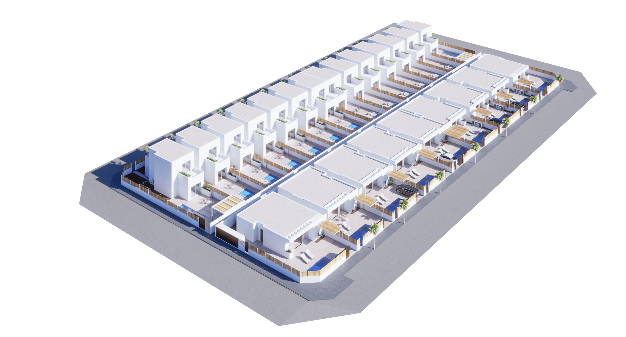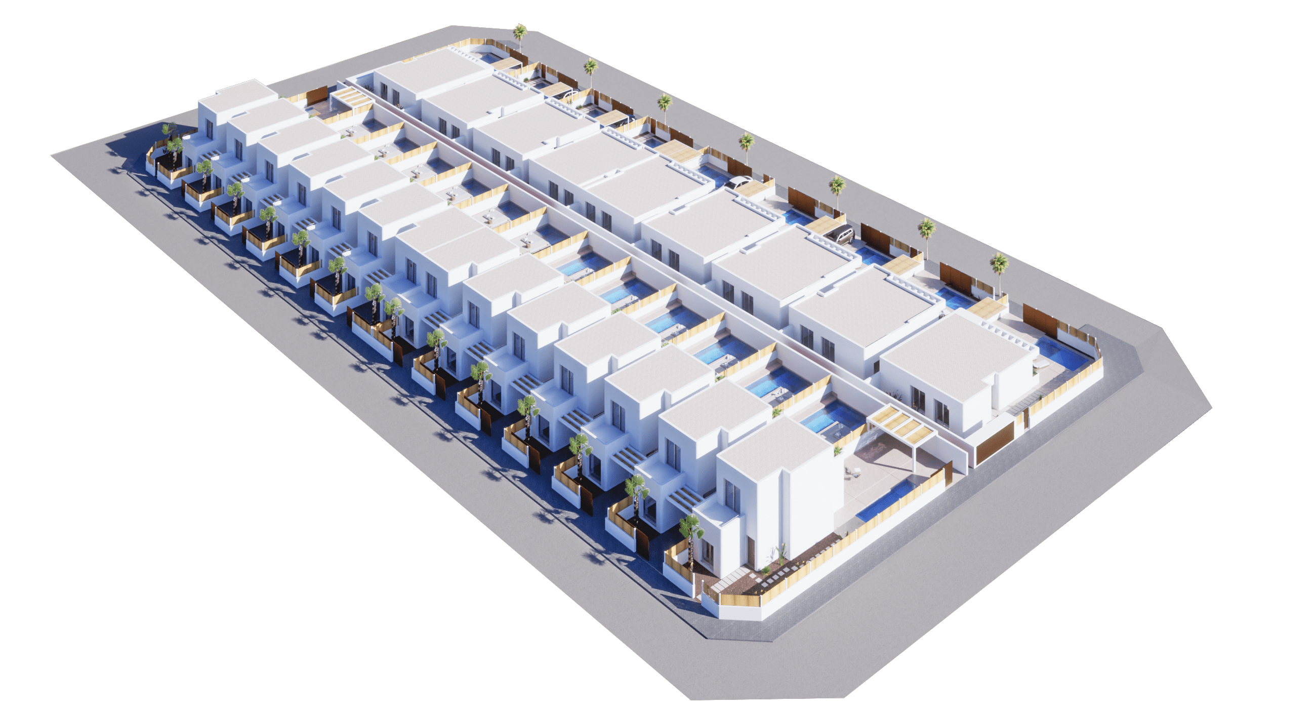 Vrijstaande villa’s met zwembad en privéparkeerplaats, verdeeld over één verdieping met drie slaapkamers en twee badkamers.