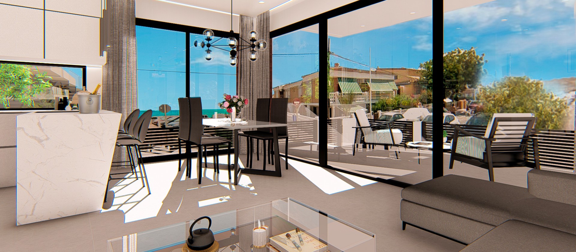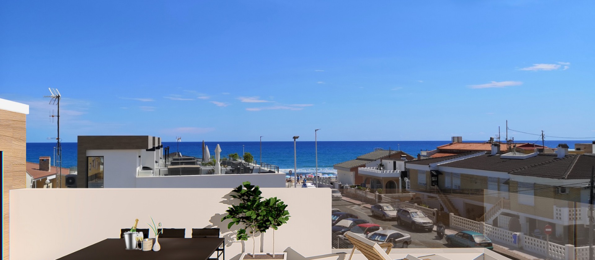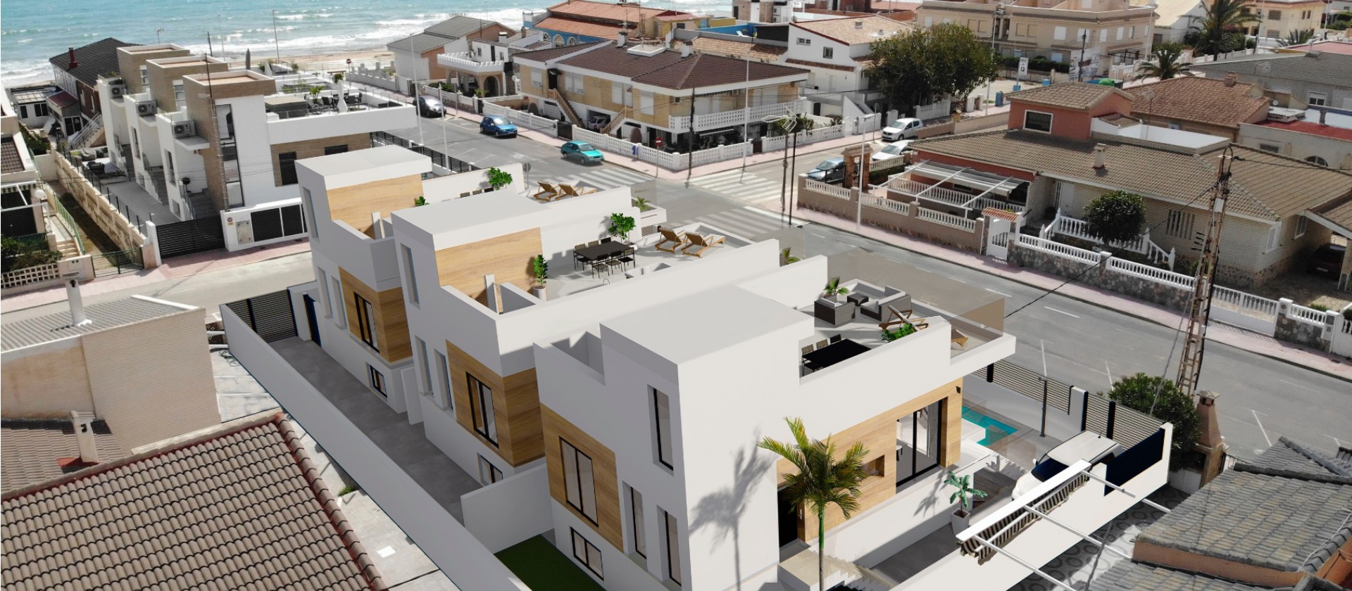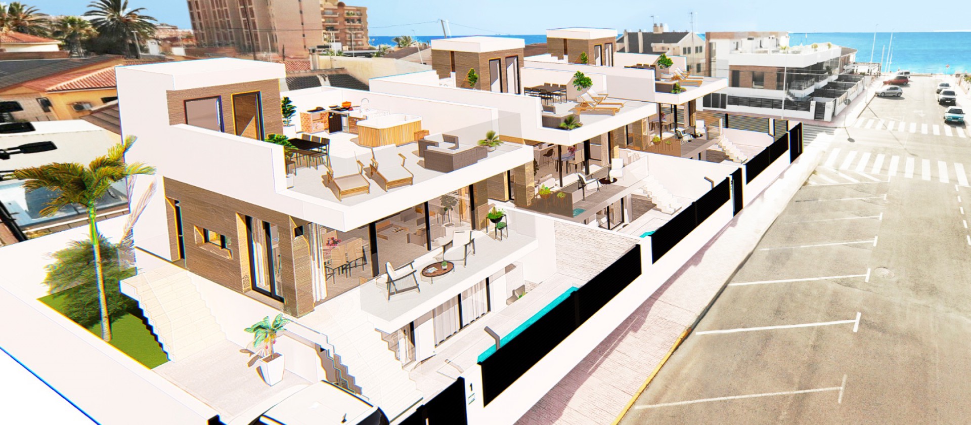 Vrijstaande villa’s op slechts 70 meter van de zee in Torrevieja. De villa’s bestaan uit twee verdiepingen plus een dakterras en hebben vier slaapkamers en drie badkamers.