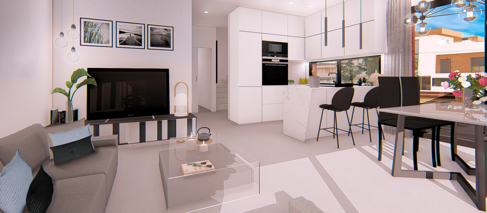 Grote woonkamer met open keuken. De keuken is uitgevoerd in een elegant wit design afgewerkt met marmer en is inclusief hoge- en lage keukenkasten.