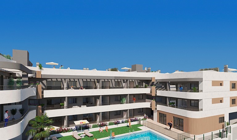 Appartementen met één en twee slaapkamers en één en twee badkamers in een woonwijk die is ontworpen met het oog op gezondheid en om rustig te kunnen genieten van het leven aan de Middellandse Zee.